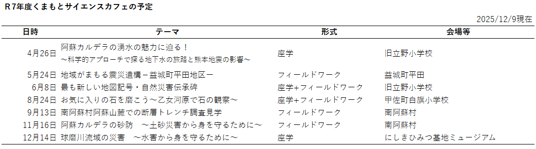 阿蘇カルデラの雄大な景観,おいしい水や農産物,そして有明や八代海の海の幸などなど,熊本は豊かな自然に恵まれています.これらの恵みは,火山噴火や地殻変動そして気候変動など長い年月をかけて形作られた大地と,そこに住む先人たちの知恵と努力によるものです.「くまもとサイエンスカフェ」では、堅苦しい講義の形式ではなく,お茶を飲みながらゆったりとした対話形で,熊本の自然や歴史を共に学び,得られた知見を豊かな暮らしづくりや,防災・減災などに役立てることを目的としています. 今年度は熊本の各地を巡りながら,活断層調査や防災工事の現場見学などのフィールドワークのほか,関係機関の協力も得て幅広い分野から「くまもとの魅力」に迫る企画を計画しています.皆さまのご参加をお待ちしています.