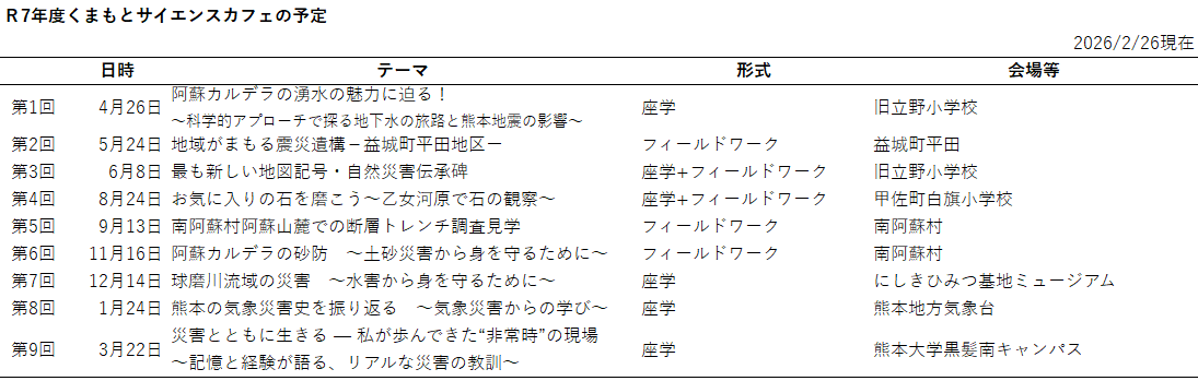 阿蘇カルデラの雄大な景観,おいしい水や農産物,そして有明や八代海の海の幸などなど,熊本は豊かな自然に恵まれています.これらの恵みは,火山噴火や地殻変動そして気候変動など長い年月をかけて形作られた大地と,そこに住む先人たちの知恵と努力によるものです.「くまもとサイエンスカフェ」では、堅苦しい講義の形式ではなく,お茶を飲みながらゆったりとした対話形で,熊本の自然や歴史を共に学び,得られた知見を豊かな暮らしづくりや,防災・減災などに役立てることを目的としています.  今年度は熊本の各地を巡りながら,活断層調査や防災工事の現場見学などのフィールドワークのほか,関係機関の協力も得て幅広い分野から「くまもとの魅力」に迫る企画を計画しています.皆さまのご参加をお待ちしています.