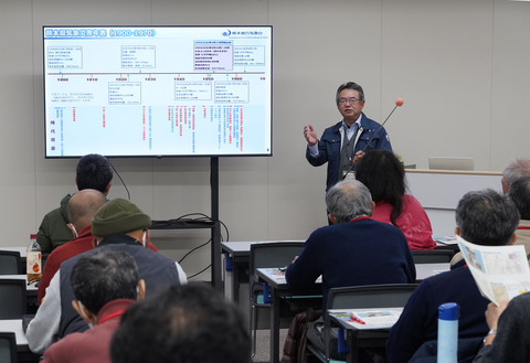 令和7年8月の豪雨では,熊本地方や天草地方を中心に,洪水や土砂災害による大きな被害が発生しました.熊本県は,昭和28年6月の熊本大水害をはじめ,過去にも甚大な大雨災害を多数経験しています.今回のサイエンスカフェでは,当時の天気図や発表された防災気象情報を用いて,過去の大雨災害を振り返りました.また,熊本地方気象台に保管された過去の天気図の展示や,現業室をご案内頂きました.
